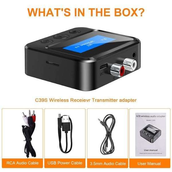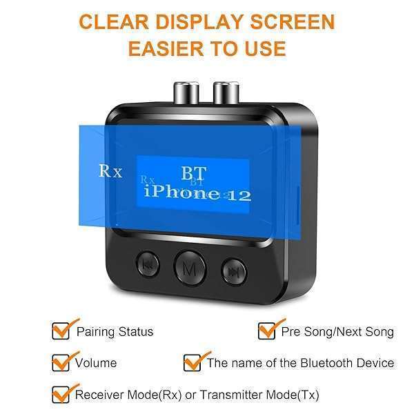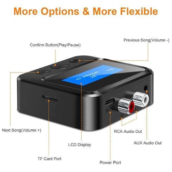 * Bluetooth Transmitter Receiver for TV, Audio Adapter for Home Stereo with RCA 3.5mm AUX & Display, Bluetooth Transmitter for Headphones/Speakers/Airplane/Home Theater/PC/Car, TF Card Output: bluetooth audio adapter: this bluetooth transmitter receiver can add bluetooth functionality to your device * Allowing you to enjoy wireless audio on devices that previously did not support Bluetooth(such as TV/PC/gaming device/mp3/mp4 * Vintage stereo * Home stereo * Speakers