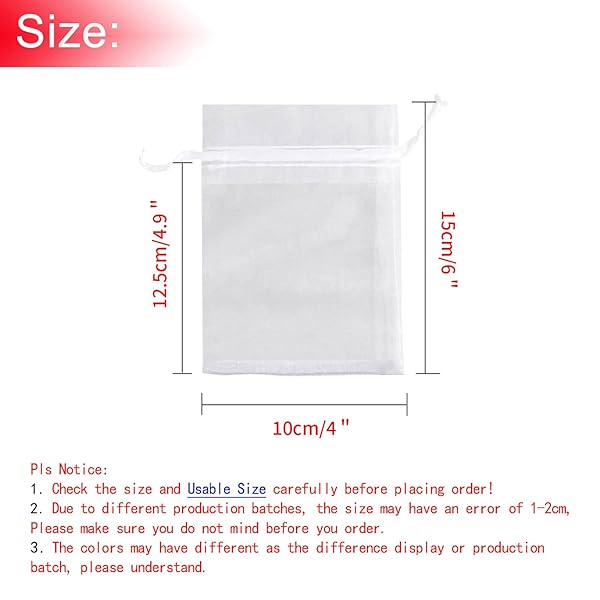 - Bezall 100Pcs Organza Bags 4x6 Inches, White Wedding Favor Bags with Drawstring, Small Mesh Gift Bag Jewelry Christmas Candy Pouches offers reliable performance and quality- 100% Brand new, Made of good quality, sheer organza material- With ribbon drawstring ties to close bag securely- Perfect for favors, cosmetics, weddings, gifts, crafts, jewelry, parties, sachets and so on- Size: 4" x 6" / 10 x 15 cm