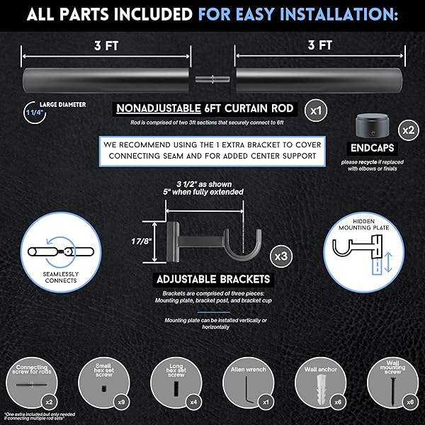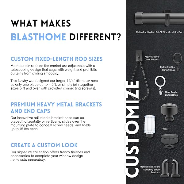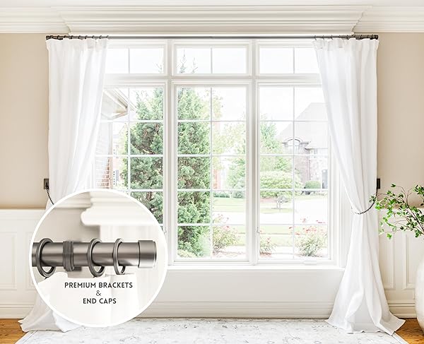 - BlastHome Non-Adjustable Luxury Curtain Rods for Windows, 1 Rod Set, 6 foot Fixed Length (Two Rods Connect for a Seamless Look), Matte Graphite offers reliable performance and quality- High Quality, Heavy Metal: Our Signature Collection raises the bar for curtain rod quality; with sturdy 1 inch metal rods, premium brackets that hold up to 15 lbs each well above the industry average and stylish design that will improve the look of any home