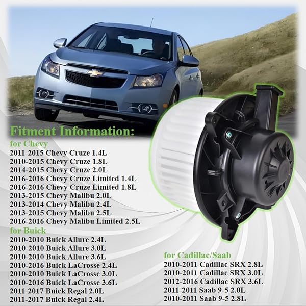 - Blower Motor 700269 Compatible with 2010-2016 Chevy Cruze 2013-2015 Chevy Malibu 2010-2016 Buick Lacrosse/Regal/Allure 2010-2016 Cadillac SRX 2010-2011 Saab 9-5 Heater Blower Motor Replace#1581637 with reliable performance and quality- Compatible Part Numbers - 1581732,1581637,1581785, 700269, 13369460.It is a direct replacement for your GM vehicles original factory component. You just need to remove the original blower motor, and install the new blower motor in place.- Com