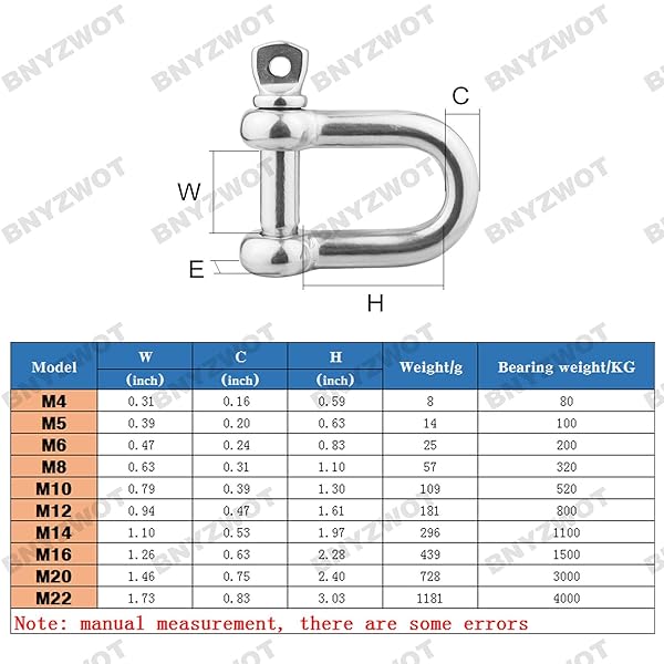- BNYZWOT M6 1/4 inch 304 Stainless Steel European Style Anchor Shackle Bow Rigging with Pin Clevis Ring Pack of 10 offers reliable performance and quality- Premium quality stainless steel hardware suitable for marine & other harsh conditions- Threaded shackle pin with key hole for tightening/loosening- Working Load (lbs.): 440.9- Use for Anchor Chain, Off Road Recovery, Towing, Sailing Hardware
