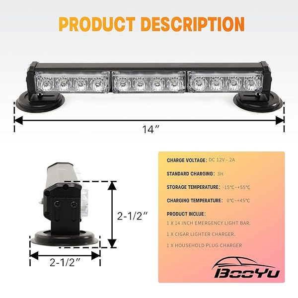 - BooYu 14" Red/White/Blue Battery Powered Police Firefighter Emergency Strobe Lights Bar for Trucks/Vehicles Rechargeable Wireless Rooftop Mini Hazard Flashing LED Beacon Warning Light w/Magnetic Base with reliable performance and quality- GET RID of WIRES - [Upgraded] It provides roughly 30 hours of long runtime and features a fast-charging function that allows the battery to be fully charged in just 3 hours.- EASY to USE - BooYu emergency warning light has 14 different fla
