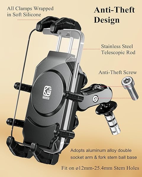 - BRCOVAN Anti-Theft Motorcycle Fork Stem Phone Mount Holder with Vibration Dampener & High-Speed Secure Lock, Heavy Duty, Adjustable Size, Big Phone Friendly, Fit for 5.4-7.2'' Cellphone with reliable performance and quality- Sturdy & Secure: The main body of this motorcycle fork stem phone mount is made of PA66+GF30% high-strength material, with built-in high-quality 304 stainless steel telescopic rods. Adopts aluminum alloy double socket arm & fork stem ball base. Providing durab