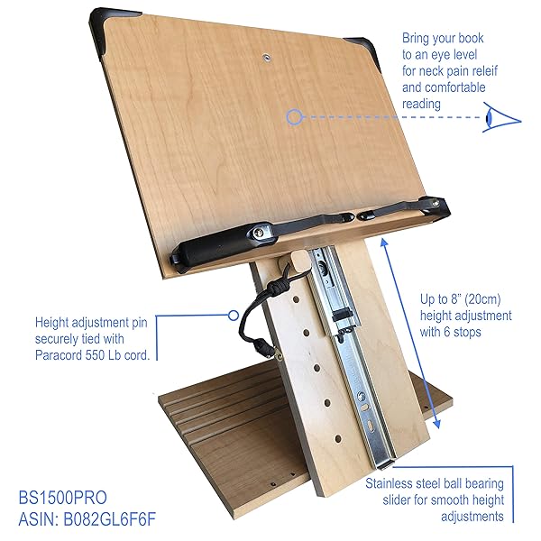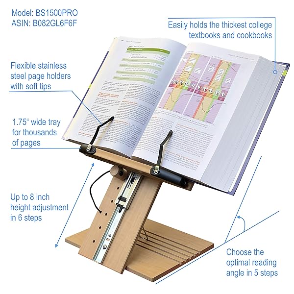 - A+ Book Stand BS1500PRO Large Portable Height Adjustable Foldable Eye-Level Ergonomic Bookstand Holder for Reading Hands Free Large Thick Heavy College Textbooks Tablets Neck Pain Free offers reliable performance and quality- PATENT PENDING - BOOK STAND BS1500PRO WITH 8" HEIGHT ADJUSTMENT - Easily adjustable height and angle allow for setting the book to perfect eye-Level