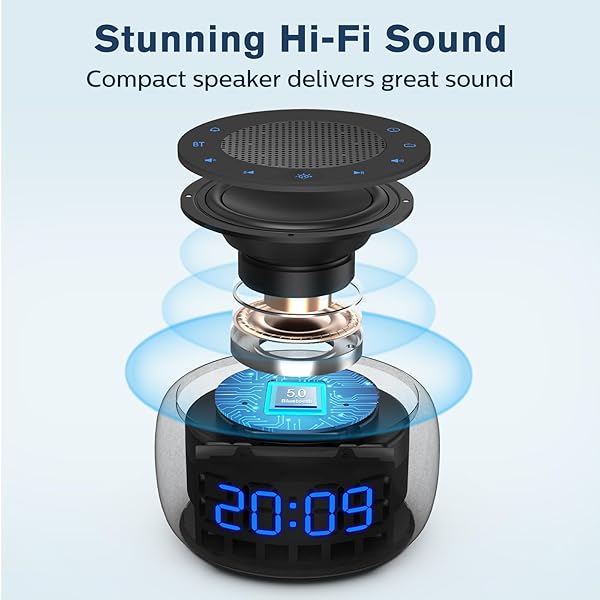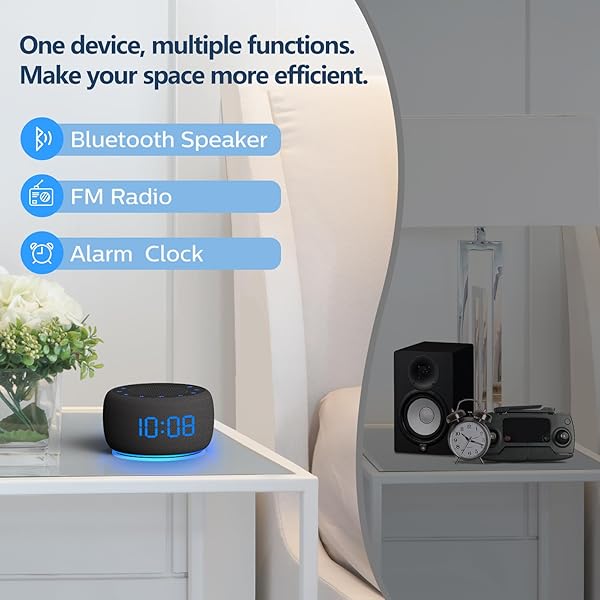 - BUFFBEE Bluetooth Speaker Alarm Clock with FM Radio - High Fidelity Sound, Full Range Dimmer, Plugged in Alarm Clock Radio for Bedroom offers reliable performance and quality- 3-in-1 for Your BedsideCombines an Alarm Clock, a Bluetooth Speaker and an FM Radio in a stylish design. It's compact and doesn't take up much room on the nightstand