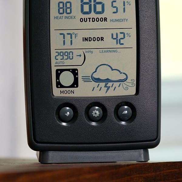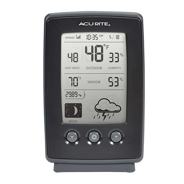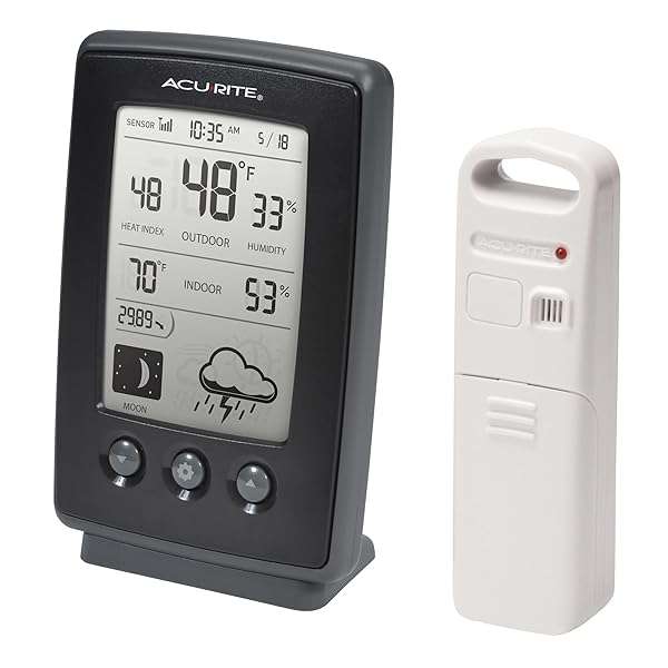 * AcuRite Digital Weather Forecaster with Indoor/Outdoor Temperature, Humidity, and Moon Phase (00829), Black: use your acurite wireless weather station to plan your day with confidence and generate a weather report right from your own backyard * The AcuRite digital weather station with wireless outdoor sensor uses patented Self-Calibrating Technology from its inside outside thermometer to provide your personal forecast 12 hours from your current conditions * The bold * Easy-to-read LCD screen