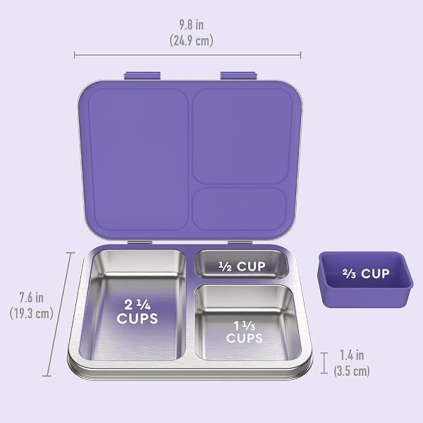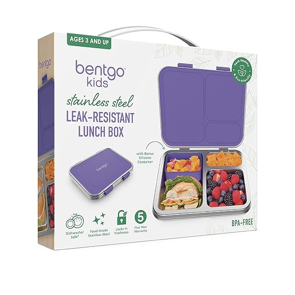 * Bentgo Kids Stainless Steel Leak-Resistant Lunch Box - 3-Compartments with Bonus Silicone Container, Durable, Eco-Friendly, Dishwasher Safe, BPA-Free, Ideal for School, Ages 3+ (Purple): #1 lunch box brand*: thoughtfully designed & rigorously tested * Theres no wonder why parents love Bentgo Kids * Americas favorite one-of-a-kind children's lunch box * It features 3 to 4 compartments portioned perfectly for a total capacity of 4 cups * Suitable for a childs appetite (ideal for ages 3-7)