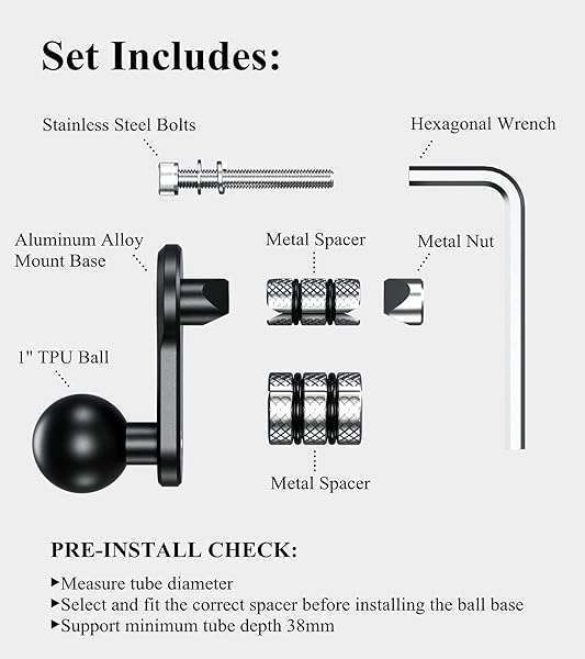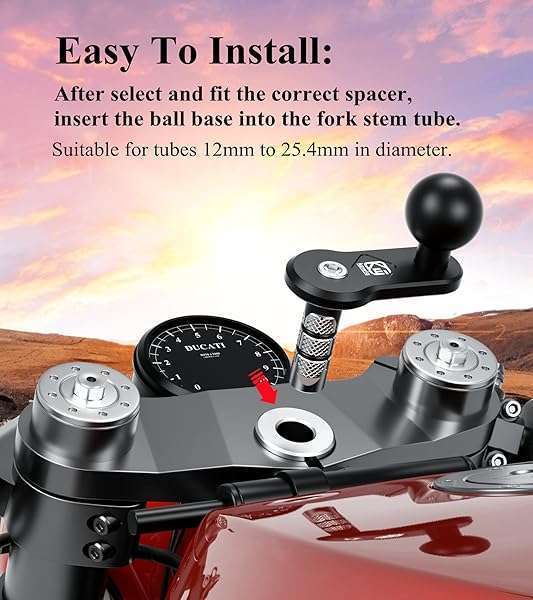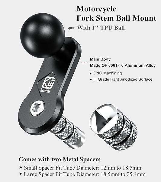 * BRCOVAN Aluminum Alloy Motorcycle Fork Stem Mount Base with 1'' TPU Ball for Stem Tube 12mm to 25.4mm in Diameter, Compatible with RAM Mounts B Size 1 Inch Ball Double Socket Arm: the ball base designed to fit into the cylindrical or hexagonal bore wall of motorcycle fork stems * Suitable for tube diameter 12mm to 25.4mm * Package comes with two sizes spacers * Small size spacer fit for tube 12mm to 18.5mm in diameter * Large size spacer fit for tube 18.5mm to 25.4mm in diameter
