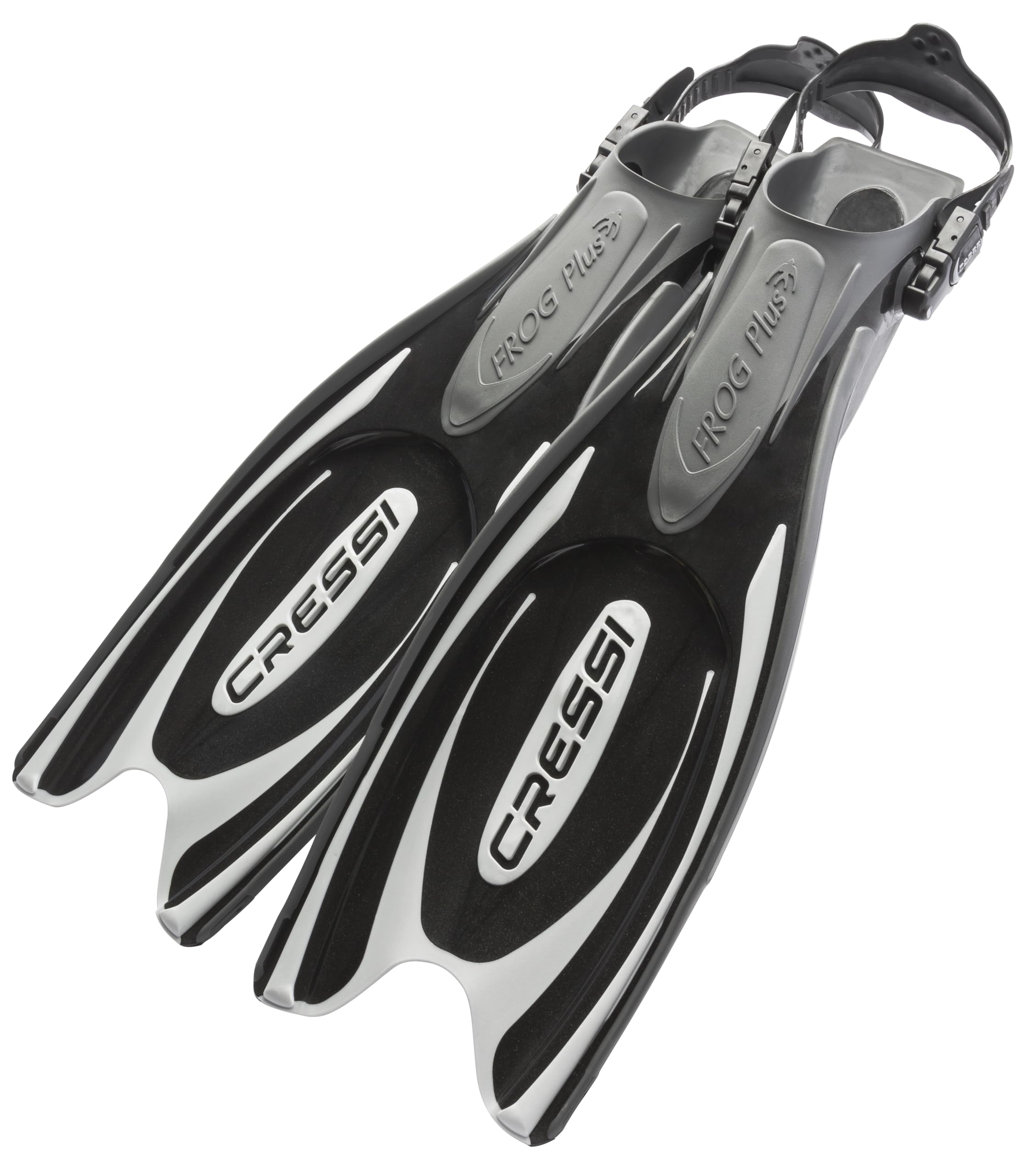 - Cressi Frog Plus, Black/Silver, L/XL provides reliable performance and quality- This formidable scuba diving open heel fin utilizes patented 3 material injection molding process that consist in a comfortable foot pocket rubber that extends up the side rails of the blade.- The dual density techno polymer, which forms the blade, combined with the third silicone based material creates a channeling effect.