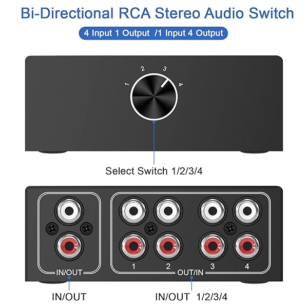 - Dingsun 4-Way Stereo Audio Switcher, Bi-Directional Right and Left Channel Audio Selector Box for Blu-ray Players or DVD Players Active Speakers (4In-1Out /1In-4Out)(1In-4Out /4In-1Out) provides re...- Right and left channel stereo audio switcher: Suitable for a variety of signal source selection switching.- Bi-Directional audio switcher: 4 input-1 output or 1 input-4 output.