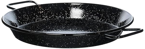 - Garcima 13-Inch Enameled Steel Paella Pan, 32cm provides reliable performance and quality- Authentic paella pan; Made in Spain- Serves 2 to 3. Top rim-to-rim dimensions: 12.75 inches. With handles: 17 inches- Included with pan is manual for use and care, plus a recipe and tips for perfect paella- Enameled coated steel. No special maintenance required. Dishwasher safe