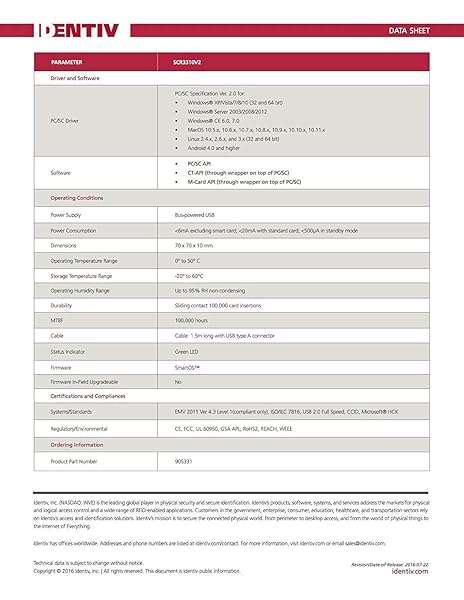 - Identiv SCR3310v2.0 USB Smart Card Reader provides reliable performance and quality- Fully Compliant - Complies With All Major Industry Standards, Including Iso/Iec 7816, Usb Ccid, Pc/Sc, And Microsoft Whql. As Well As, Emv 2011 Ver 4.3 Level 1 And Gsa Fips 201.- Seamless Integration - With Identiv-Specific Smartos YouLl Get Easy, Complete Support Of All Major Contact Smart Card Ics And Technologies In One Simple Reader.