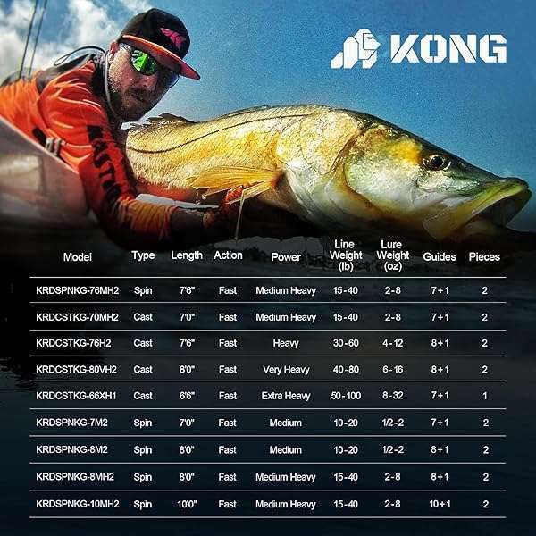 * KastKing Kong Fishing Rod, Spinning Rod 2 pc 8' MH: powerful s-curve graphite rod blanks * KastKing KONG series rods are designed for anglers targeting massive fish in fresh and saltwater! These lightweight * Powerful * 100% graphite blanks are made of high-strength S-Curve graphite reinforced with Nano-Resin technology that delivers amazing strength and lifting power but are still incredibly light and sensitive * Stainless-Steel Double Foot Guides Because KastKing KONG rods are made to handle