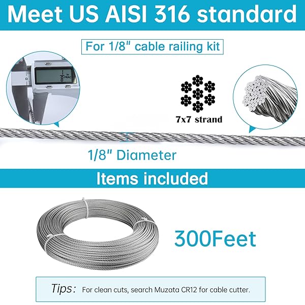 - Muzata 300 ft 1/8" Stainless Steel Cable Railing System Hardware T316 Stainless Steel Wire Rope 7x7 Strands 1800 lb Breaking Strength Deck Cable Railing Kit for Indoor Outdoor Coastal WR02 offers reliable performance and quality