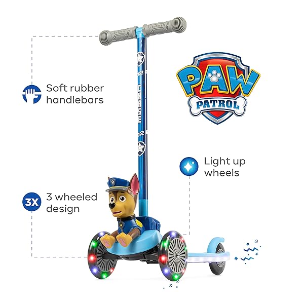 * Paw Patrol Chase Kick Scooter for Kids, Self-Balancing 3 Wheeled Light Up Scooter with Extra Wide Anti-Slip Deck, Rear Brake, Lean to Steer, Lightweight Design, for Kids 3 and up, 75 LB Limit: unique 3 wheel design: the paw patrol chasekick scooter is designed with 3 heavy duty * Durable wheels that offer a smooth * And very steady ride * Ride comfortably on both smooth and uneven surfaces with ease * Self-Balancing for Stress Free Riding: This Scooter is built to take the worries of losing