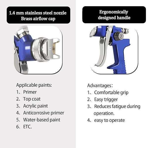 - PNTGREEN HVLP Spray Gun Gravity Feed, 600CC Capacity, with 1.4mm Nozzle Professional Air Paint Sprayer Spray Guns for Painting Cars provides reliable performance and quality- SPECIFICATIONSType of Feed: Gravity / Fluid Nozzle:1.4 mm / Air pressure: 3 bar (43 PSI) / Air consumption:15 cfm / Paint Capacity:600 CC / Air Inlet:1/4"