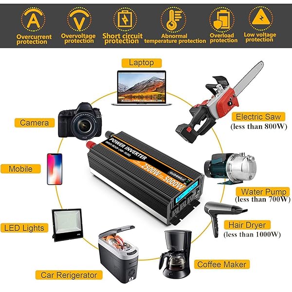 Buy SUDOKEJI 2500W Power Inverter - 12V DC to AC 110V/120V, 5000W Peak, 3 Sockets, Remote Control & USB Port
