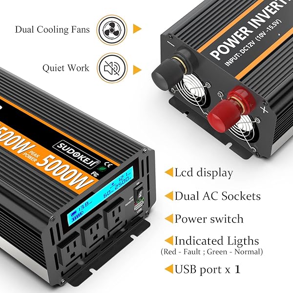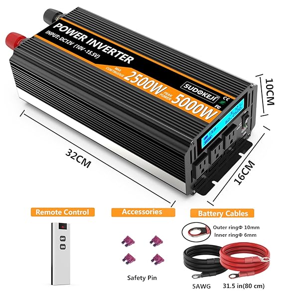 - SUDOKEJI 2500W Power Inverter 12V DC to AC 110V/120V (Peak) 5000W Converter 3 sockets car Inverter with Remote Control and LED Display 3.4v USB Port provides reliable performance and quality- SUDOKEJI power inverterProfessional old brand. Convert 12V DC to AC 110V/120V household outdoor emergency power supply, with continuous 2500 watt output (5000 watt surge capability). With 3 AC sock...