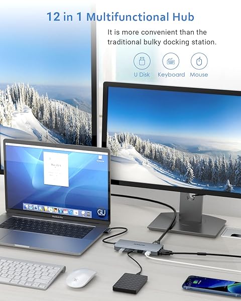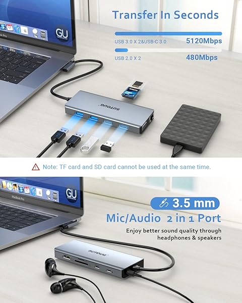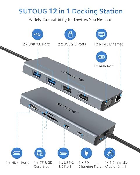 * USB C Hub, SUTOUG 12 in 1 Docking Station with 4K HDMI & 1080P VGA, 92W PD, 1Gbps Ethernet, USB-C 3.0 & 4 USB-A Data Ports, SD TF Card Reader, USB C Adapter for Surface Pro MacBook Pro Air & Windows: 12 in 1 multifunctional hub * Our USB C hub with dual display * Which is portable * Highly practical and powerful * It is more convenient than the traditional bulky docking station which can realize multi-screen display