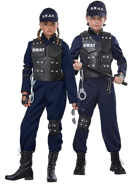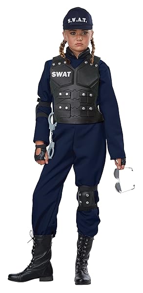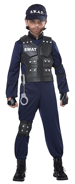 - California Costumes Child Junior SWAT Costume Medium offers reliable performance and quality- Jumpsuit, Vest, Glovelettes, (1) Knee Pad, (1) Elbow Pad, Handcuffs, Hat- Spot Clean Only- NAVY- Medium
