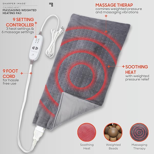 - Calming Heat Massaging Vibrations Weighted Heating Pad by Sharper Image | Temperature Settings, Auto Shut-Off Feature, Gift for Holidays, Women & Men | 3 Heat, 6 Massage, 12 x 24, 4 lbs: reliable performance and quality- 18 RELAXING COMBINATIONS: With 3 heat levels & 6- WEIGHTED & MASSAGING: Calming Heat combines soothing- EASY TO USE: This heating pad is 12 x 24, 4 lbs & is- MASSAGING VIBRATIONS: Our weighted heating pads