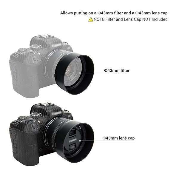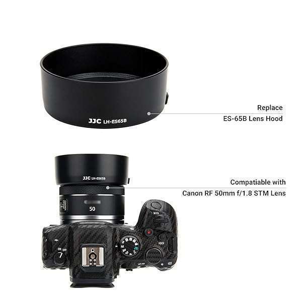 - Lens Hood for Canon RF 50mm F1.8 STM on EOS R6 R5 RP R Camera, Reversible Lens Shade Replace Canon ES-65B Lens Hood, Compatible with 43mm Filters and 43mm Lens Cap provides reliable performance and...- Replace ES-65B Lens Hood:Compatible with Canon RF 50mm F1.8 STM Lens on EOS R6 EOS R5 EOS R EOS RP.- EASY TO USE:Easy to install, connect the hood directly to the lens through bayonet.Allows putting on a 43mm filter and a 43mm lens cap.