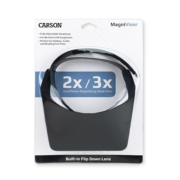 - Carson Magnivisor 2X Hands Free Head-Worn Magnifier (MV-23) provides reliable performance and quality- Head worn, dual lens magnifier straps around your head for hands free use | Lightweight and ergonomically designed to fit comfortably around your head.- Built-in flip down lens increases the magnification from 2x to 3x power