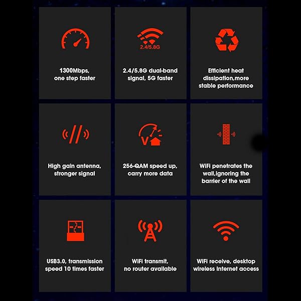 - CF-924AC USB WiFi Adapter, 1300M Dual Band 2.4GHz/5.8GHz Network Card, Gigabit Computer Receiver offers reliable performance and quality- High Speed Internet AccessThe adapter comes with 2.4GHz and 5.8GHz dual band, dual-channel bring high-speed Internet access- 1300Mbps1300Mbps highspeed, smooth online movie watching, surfing on the Internet, and more fun playing games