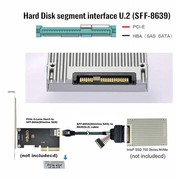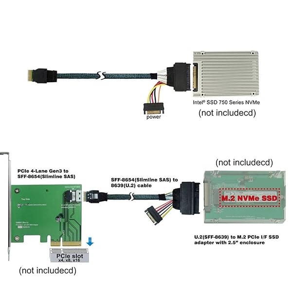 - chenyang PCIe 4.0 SFF-8654 to SFF-8639 Cable with SATA Power for U.2 SFF-8639 NVME SSD Motherboard Internal Expansion 1.64FT/0.5M provides reliable performance and quality- The Cable only support PCI-E, not support SAS raid card.- For Mainboard Intel SSD 750 M.2 SFF-8654 Ultraport Slimline.- Ultraport Slimline SAS 4i plug to U.2 SFF-8639 Port.- Data speed: 24Gbps for SAS and 8GT/s for PCIe per channel.