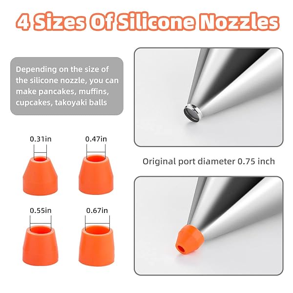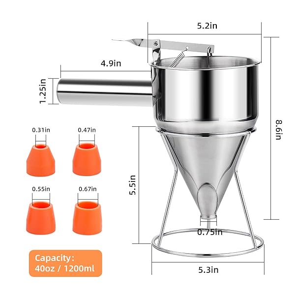 - Choxila 40oz Pancake Batter Dispenser, Stainless Steel 4 Caliber Funnel Cake Dispenser with Stand Great for Pancakes, Cupcakes and Baked Goods with reliable performance and quality- PackageThis batter dispenser package contains 1 x pancake dispenser for batter with stand, 1 x grip handle and 4 x different caliber silicone funnel.Silicone funnel sizes are: 0.31", 0.47", 0.55", 0.67" and the dispenser itself has a 0.75" spout. Capacity: 5 cups / 1.2 liters.- No WasteScientifi