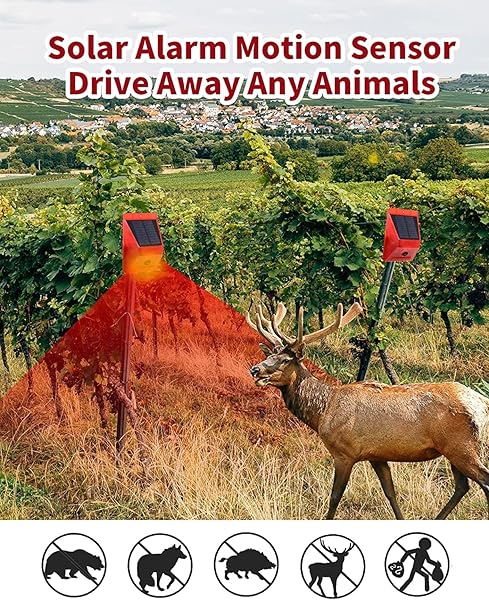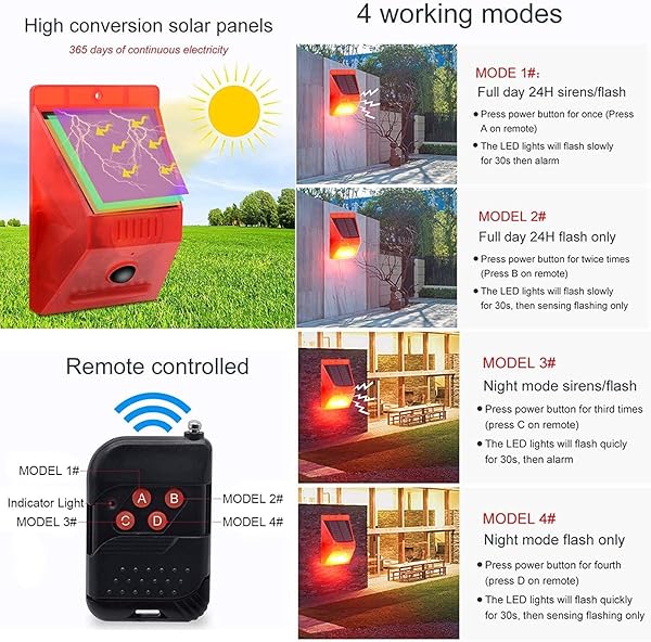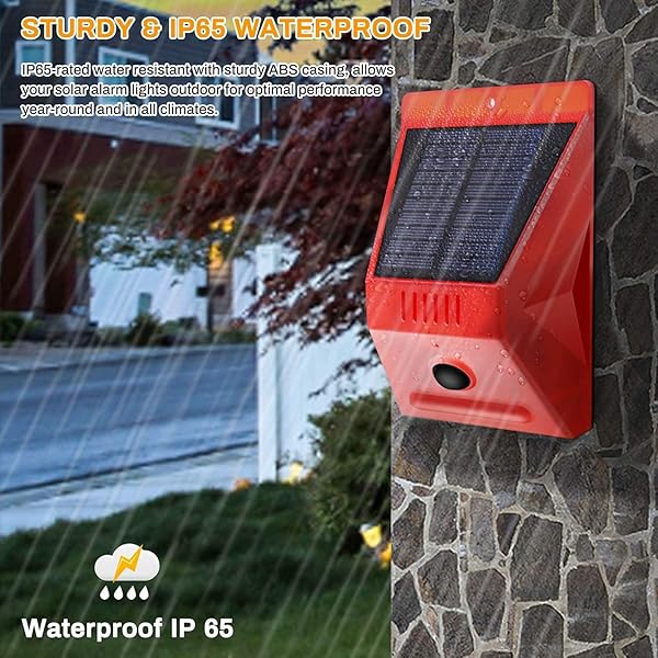 - ChunHee Solar Alarm Strobe Light with Remote Control Motion Sensor Detector Outdoor Alarm 129db Sound Security Siren IP65 Waterproof Protected for Villa, Chicken coop, Barn, Farm, Yard with reliable performance and quality- Advanced Solar motion sensor alarmOutdoor motion sensor alarm have sturdy ABS casing, IP65 Waterproof dustproof, sensing angle of is 125, which will widely capture any movement within 5-8 meter activate the alarm to scare animals and thieves.- Remote-Con