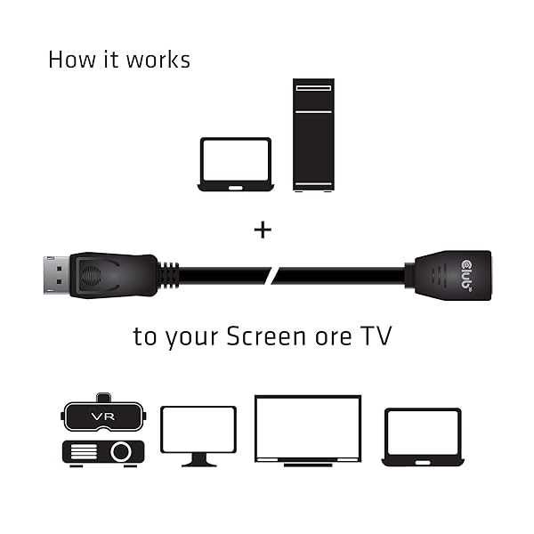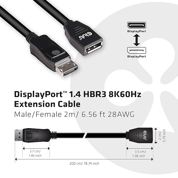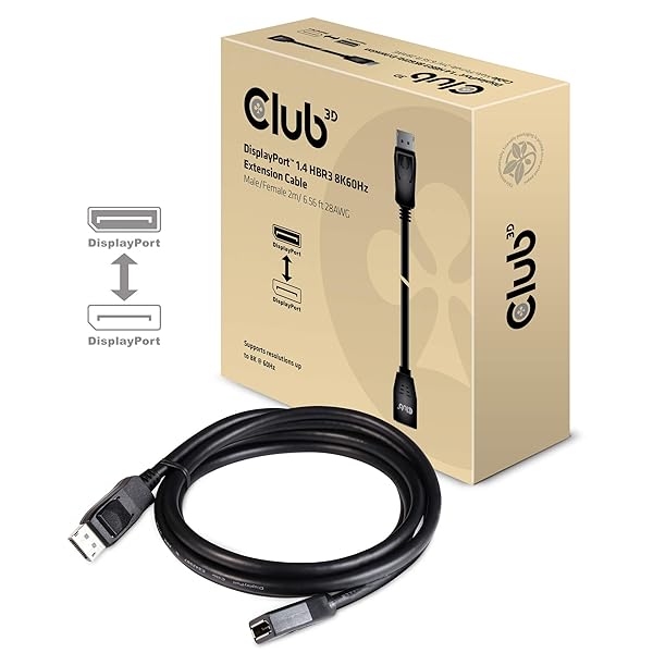 - Club 3D CAC-1022 DisplayPort 1.4 HBR3 8K60Hz or 4K144Hz Extension Cable M/F 2m /6.56 ft offers reliable performance and quality- High quality 28Awg DisplayPort to DisplayPort 1.4/HBR3 cable DP 1.4 8K 60Hz 2m/6.56ft, male-female extension cable- Displayport 1.4 feature support for high-bandwidth HBR3, 32.4 Gbps bandwidth, DSC 1.2 display stream compressions support, Fec forward error Correction, high dynamic range( HDR)