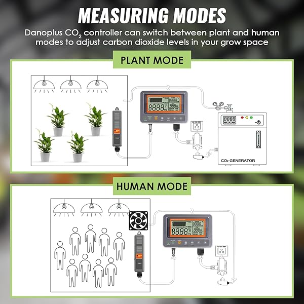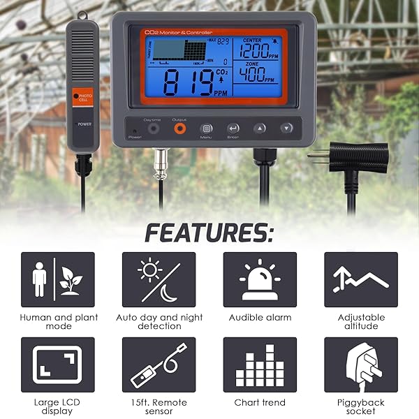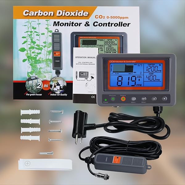 * CO2 Controller Carbon Dioxide Controller CO2 Meter Monitor Day and Night Relay Function, NDIR CO2 Sensor for Green House, Grow Rooms, Factory, Home, Office: co2 controllerthis co2 controller is equipped with wide lcd screen * 0-5000 ppm measuing range * It's able to record trend chart of CO2 levels per minute/hour/day/week for analysis * Plant Mode&Human ModeThe Carbon Dioxide Controller is designed with Plant Mode and Human Mode * Can mannually control the CO2 level for CO2 generator in Grow