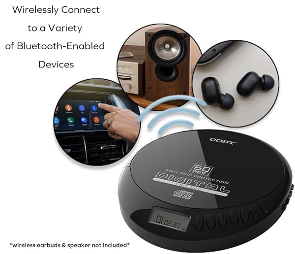 - Coby Portable Bluetooth CD Player with FM Radio & Headphones, Rechargeable Anti-Skip Discman with MP3 Playback, AUX Input, Super Bass, Compact Retro Music Player for Home, Car, and Travel Black with reliable performance and quality- RETRO CD PLAYER WITH BLUETOOTH FUNCTIONALITY The Coby Portable Bluetooth CD Player brings back the joy of classic music with a modern wireless twist. Connect to Bluetooth speakers, earbuds, or car audio systems, or use the included wired headphones f