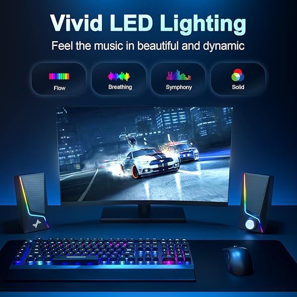 Computer Speakers, PC Speakers with 6 Lighting Modes, USB Powered Computer Speakers for Desktop Monitor with 2 Bass-Boost Ports, 2 Speaker Units, and 3.5mm Aux-in Cable for PC, Laptop, Tablet, Phone