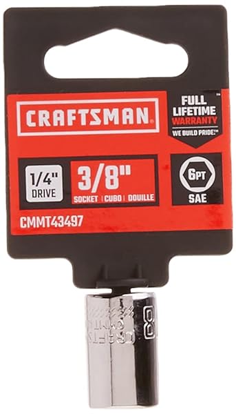 - CRAFTSMAN Shallow Socket, SAE, 1/4-Inch Drive, 3/8-Inch, 6-Point (CMMT43497): reliable performance and quality- CORROSION RESISTANCE: The Shallow Socket Has Full Polish Chrome Finish- INCREASED TORQUE: 6 Point Socket with fastener- QUICK SIZE IDENTIFICATION: Large Markings- Meets or Exceeds ASME Specifications