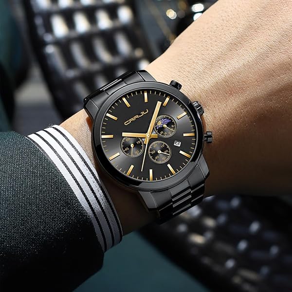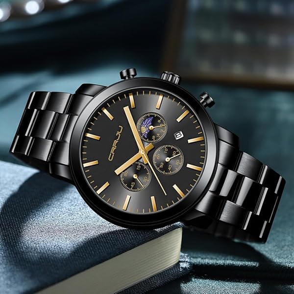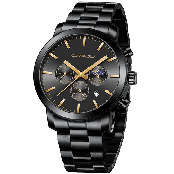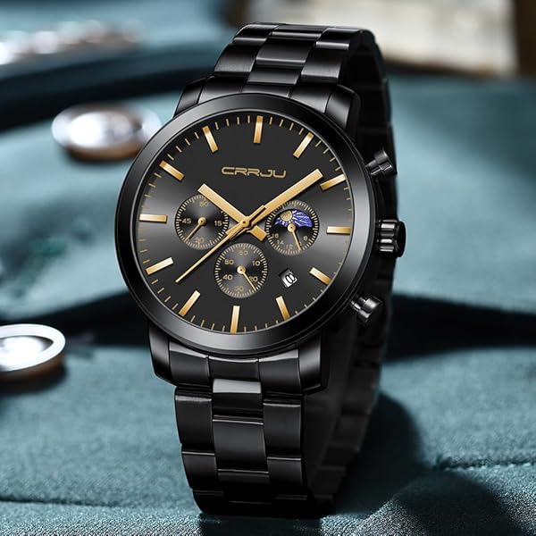 - CRRJU Watches for Men Luxury Business Stainless Steel Waterproof Calendar Chronograph Analog Quartz Wristwatches with reliable performance and quality- UNIQUE DESIGN: Chic Phase of the Moon Dial,Second and Minute Stopwatches;Classic Square Calendar;- HIGH QUALITY:Japan Movement provide accurate time keeping; Thick Extra-Long 316L Black Solid Stainless Steel Band- DURABLE COMFORTABLE: IP Matte Plating Watch Case,Never fade;Hardlex;Suitable watch weight, Smooth Watch s