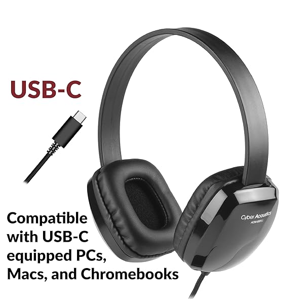 - Cyber Acoustics USB Stereo Headphones for PCs and Other USB Devices in The Office, Classroom or Home (ACM-6005C) with reliable performance and quality- Simple plug and play USB C headphone connects to any USB C device; no installation or software needed- Adjustable headband with easy to clean leatherette earpads; headband and tangle free Nylon braided TuffCord cable can be coiled or twisted or chewed without sacrificing performance- The ACM 6005C features an adjustab