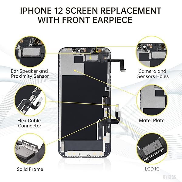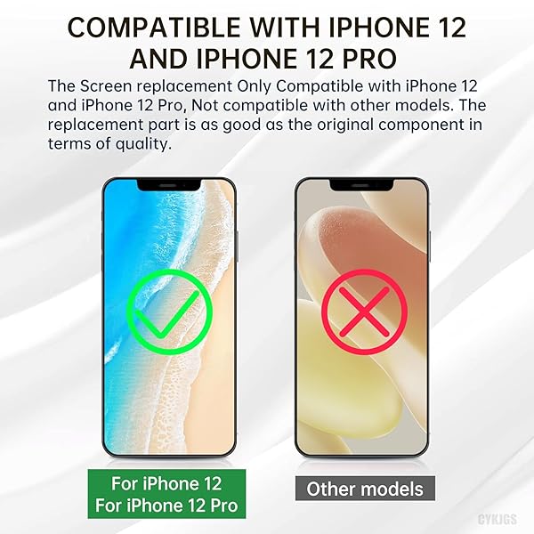 - CYKJGS for iPhone 12 Screen Replacement 6.1" for iPhone 12 Pro with Ear Speaker and Proximity Sensor 12pro 3D Touch LCD Display Digitizer Full Assembly Repair Kits Fix Tools A2172 A2402 A2403 A2404 with reliable performance and quality- CompatibilityThe screen replacement Compatible with iPhone 12 and for iPhone 12 Pro, 6.1 inch (for iPhone 12 model: A2172, A2402, A2403, A2404; for iPhone 12 Pro model: A2341, A2406, A2407, A2408). Its not suitable for Other Models. Please confirm