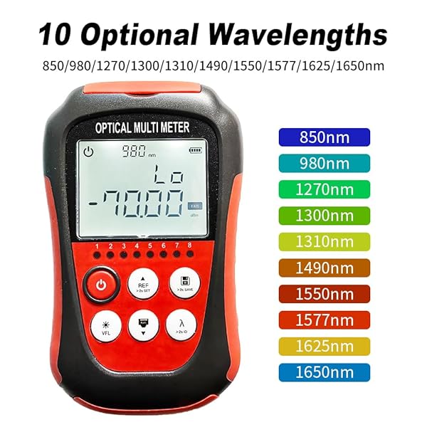 - D YEDEMC Fiber Optic Cable Tester Portable Optical Fiber Power Meter FC/SC/ST Universal Interface Integrated OPM, VFL, and RJ45 Functions (OPM-VFL-4) with reliable performance and quality- Function: can measure 8 standdard wavelengths 850/980/1300/1310/1490/ 1550/1625/1650nm , test range: -50dBm~+26dBm, Integrated OPM, VFL, and RJ45 Functions.- Support lighting,Support automatic shutdown,Support backlight selection, Support wavelenghth memory function,Support user calibrati