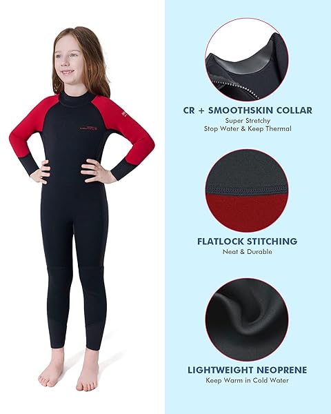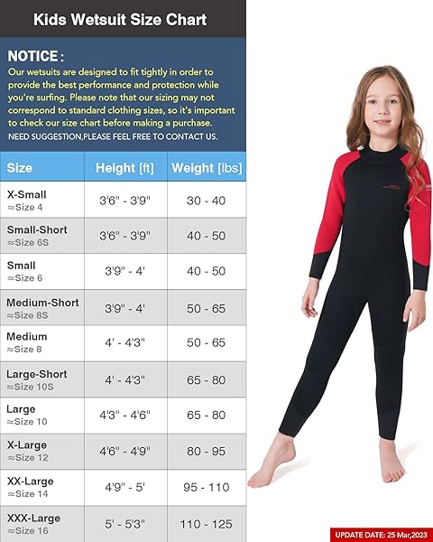 - Dark Lightning 3/2mm Kids Wetsuit for Boys and Girls, Neoprene Thermal Swimsuit, Toddler/Junior/Youth One Piece Wet Suits for Scuba Diving,Red/Size 6 offers reliable performance and quality- Dark Lightning kids wetsuits are designed in a "tight/snug fitting" with soft/ultra stretch neoprene to against cold- 3/2 mm : 3mm torso / 2mm arms and legs, suggest for over 59F water