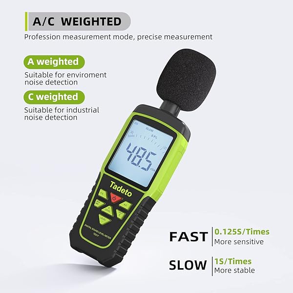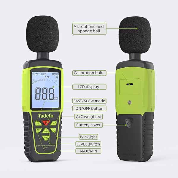 - Decibel Meter, Tadeto Digital Sound Level Meter Portable SPL Meter 30dB to 130dB(5 Measurement Range) Backlight LCD Display, MAX/MIN Noise Measurement, Audible and Visual Alarms,Data Hold, A/C Mode with reliable performance and quality- Accurate Measurement The measuring range of the decibel meter is 30dB to 130dB and shifting function(5 adjustable measurement ranges) . Highly accurate with 1.5 dB. Real-time monitoring can give you accurate data on the sound level in the area.</l