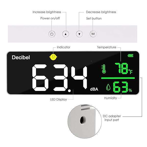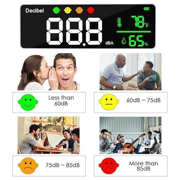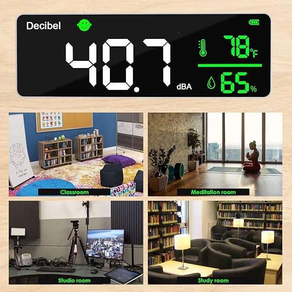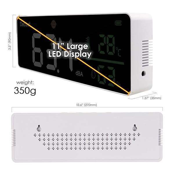 - Decibel Meter Wall Hanging Sound Level Meter 11 inch Large LED Display Noise Temperature Humidity Meter with Alarm Icons Indicator Wide Applications for Classroom, Studio, Home, Factory provides re...- Large 11-inch LED DisplayDANOPLUS decibel meter is equipped with 11 inches LED screen and brightness adjustable, you may see the real-time decibel level, Temperature and Humidity more clearly