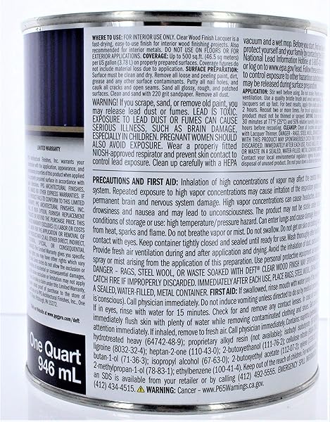 * Deft Interior Clear Wood Finish Gloss Brushing Lacquer, Quart: product description * This clear wood finish brushing lacquer is 100-Percent nitrocellulose brushing lacquer for most interior wood and metal surfaces * Fast 2-hour dry and self-leveling * Easy to application provide professional results * Sanding between coats is not necessary