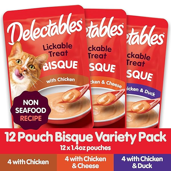 * Delectables Bisque Non-Seafood Lickable Wet Cat Treats, Variety Pack, 12 Count (Pack of 1): delectables lickable treat bisque features a unique combination of real * Tender ingredients in a smooth & creamy bisque that'll have even the pickiest cats meowing for more! Crafted with premium cage-free chicken & duck and cheese * These treats offer a perfect mix of delicious nutrition and hydration boost * This innovative recipe perfectly blends the sauce and high-quality protein * So your cat can