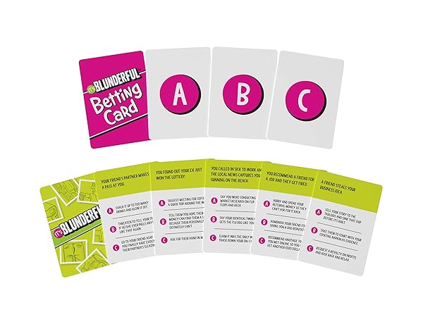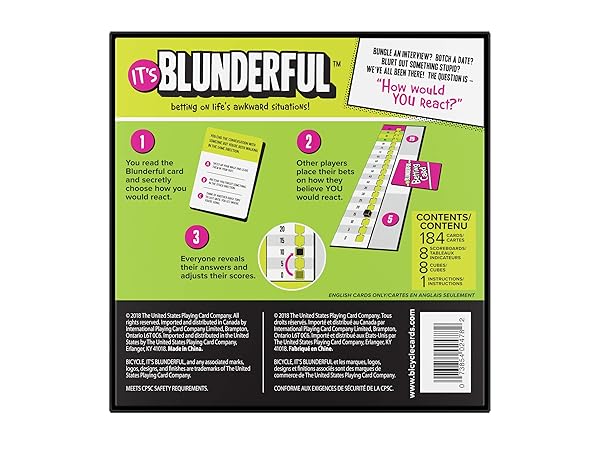 * Bicycle It's Blunderful - Games Party Games - Card Game: it's blunderful is a party board game that is simple * Fun and engaging * You will bet on how others would respond in various awkward situations * Everyone takes a turn to read a card with an awkward situation and accompanying reactions * The other players make their wager and guess how the reader would respond