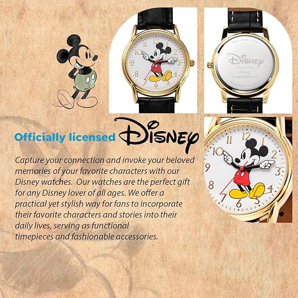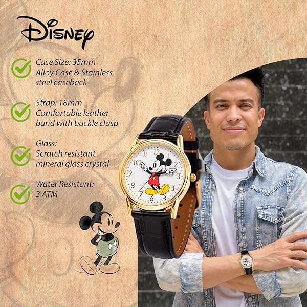 - Disney Mickey Moving Hands Watch - Vintage Mickey Mouse Watch for Men - 90s Mouse Watches - Classic Mens Toys - Retro Style - Gold Case - Black Leather Strap provides reliable performance and quality- Officially Licensed Disney Watch This Mickey Mouse watch for men is a must-have for Disney enthusiasts and collectors. Featuring Mickey's iconic design, complete with articulating hands, this vint...