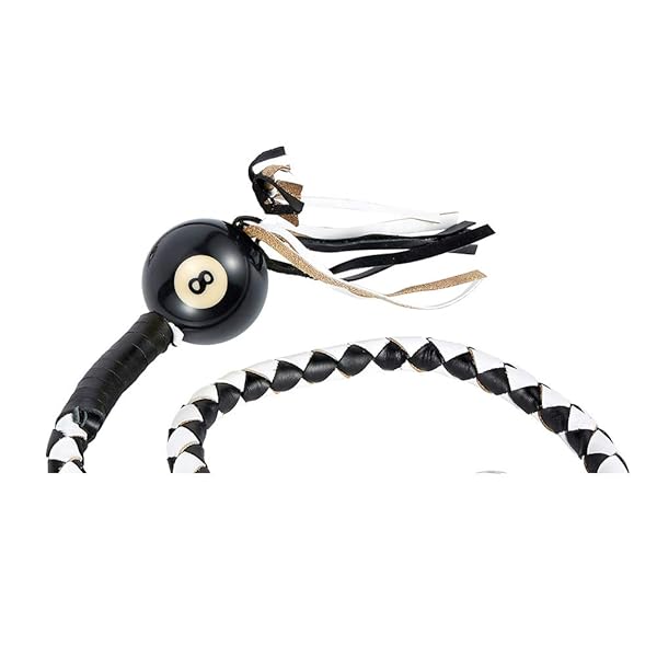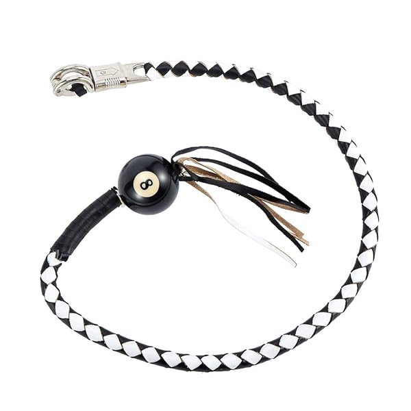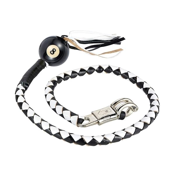 - 42" Long 1/2 Diameter White and Black Motorcycle Get Back Whip with White Pool Ball: reliable performance and quality- Get Back Whip. white and black hand-braided leather around a nylon core.- Gorgeous black pool ball with the number 8. Black and white threaded fringe on the end.- Solid, stainless steel heavy duty quick-release panic buckle. Tight, black leather- 42" Long. Pool ball8 size: 2.25 Diameters. Clasp diameter 3/4" x 3/4".