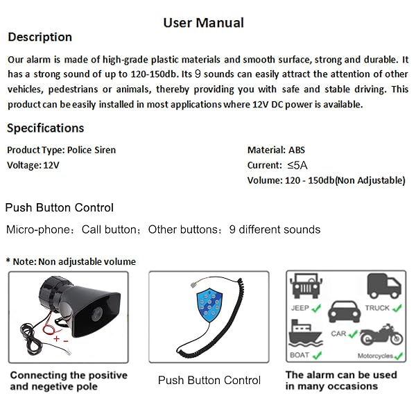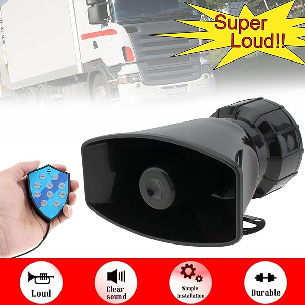 - DriSentri Car Speaker 100W 9 Sounds 12V Car Siren Horn Speaker with Hook Bracket, Call Function, 120-125dB Warning Alarm Electronic Horn with reliable performance and quality- 9 Siren Sounds: The car siren speaker can offer 9 loud and clear sounds, includes hooter, fire alarm, ambulance, traffic, police, etc. You can choose among them according to different occasions.- Loud and Clear: The sound car siren is handy but loud and clear for its size. Please Not to be used as a r