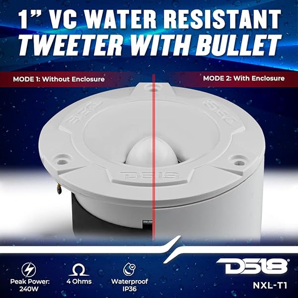 - DS18 NXL-T1 Marine 1 VC Waterproof Aluminum Bullet Tweeter 240W Max, 4 Ohms, Built in Crossover - Great for Boats, Motorsports, Motorcycle ATV UTV (2 Water Resistant Speakers): reliable performance and quality- WATERPROOF TWEETERS - 100% waterproof construction so- PROFESSIONAL GRADE SUPER TWEETERS - This tweeter is- ALL ELEMENTS - These tweeters are perfect for exposed- TOP OF THE LINE TWEETERS - Professional grade super